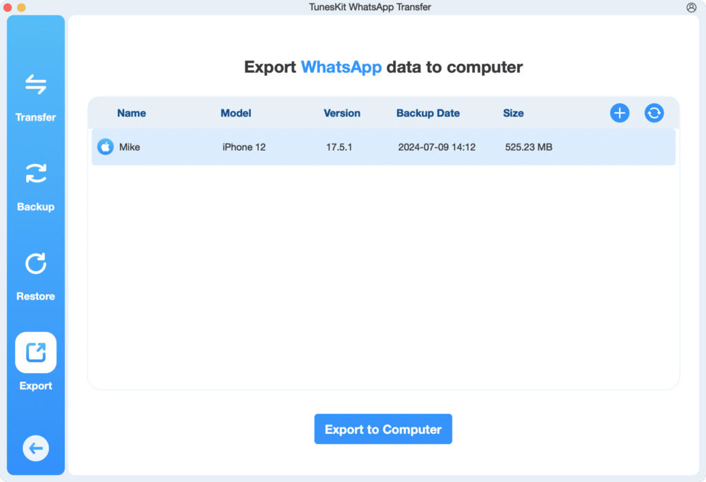يُسهل TunesKit WhatsApp Transfer عملية النسخ الاحتياطي لبيانات واتس اب بشكل بسيط وفعّال من خلال تقديم حل مخصص. باستخدام TunesKit WhatsApp Transfer، يمكنك تصدير ملفات النسخ الاحتياطي إلى جهاز الكمبيوتر الخاص بك، واستعادة ملفات النسخ الاحتياطي على جهازك، ونقل بيانات واتساب بين أجهزة iOS. إنه برنامج متخصص في نقل بيانات الواتساب. لن يواجه المستخدمون أي صعوبة في نقل بيانات واتساب إلى هاتف جديد بفضل واجهة الاستخدام المبسطة.