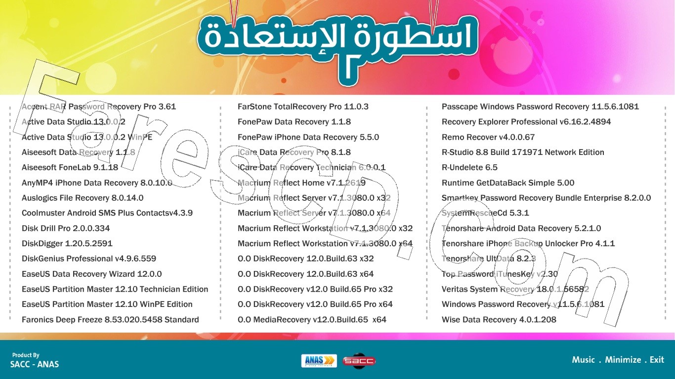 تتميز التجميعة بشموليتها … لأنها تضم برامج لاستعادة كافة انواع الملفات والبيانات من مختلف وسائل التخزين سواء الهارديسك العادى أو الخارجى وكذلك الفلاشات وكروت الميمورى والهواتف الذكية.