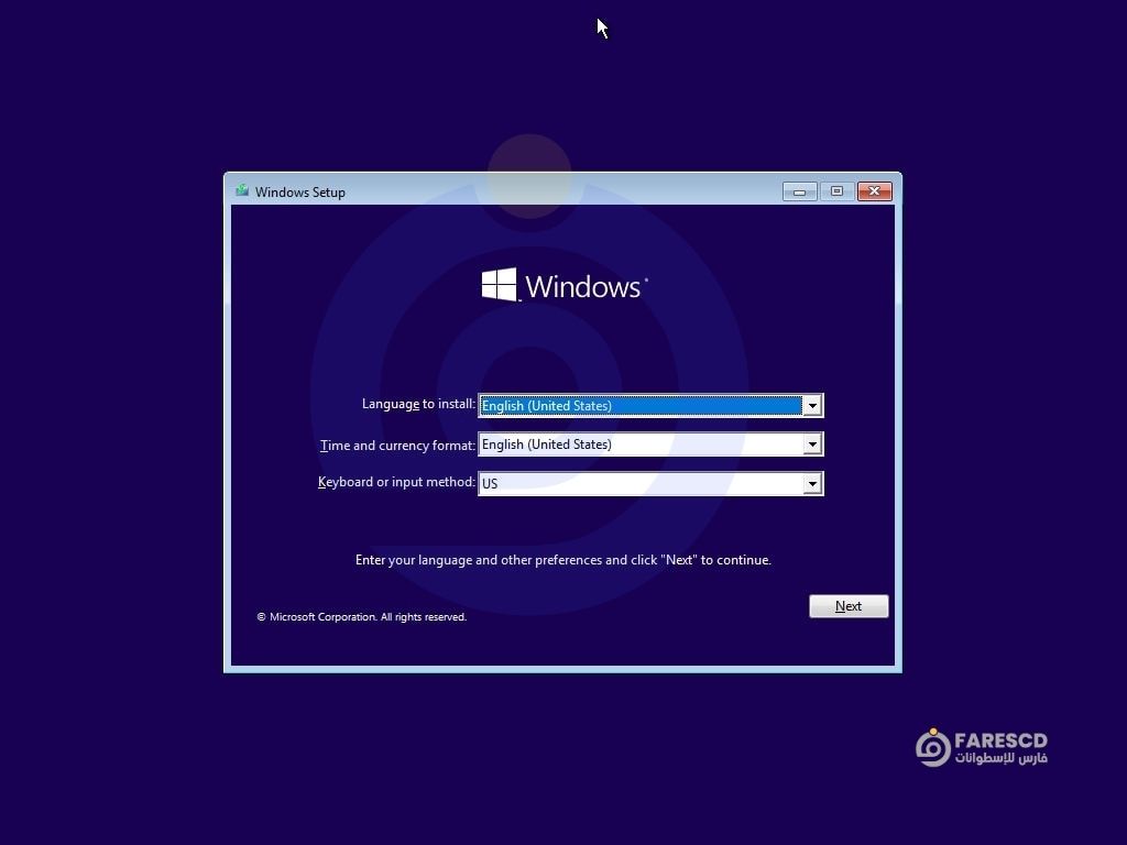 اختر في معالج التثبيت نفس لغة النسخة التي استخرجت منها ملف Install.wim/Install.esd، فاختيار لغة غير مضمنة داخل الـISO قد يؤدي لفشل الإعداد أو توقف خطوات ما قبل النسخ.