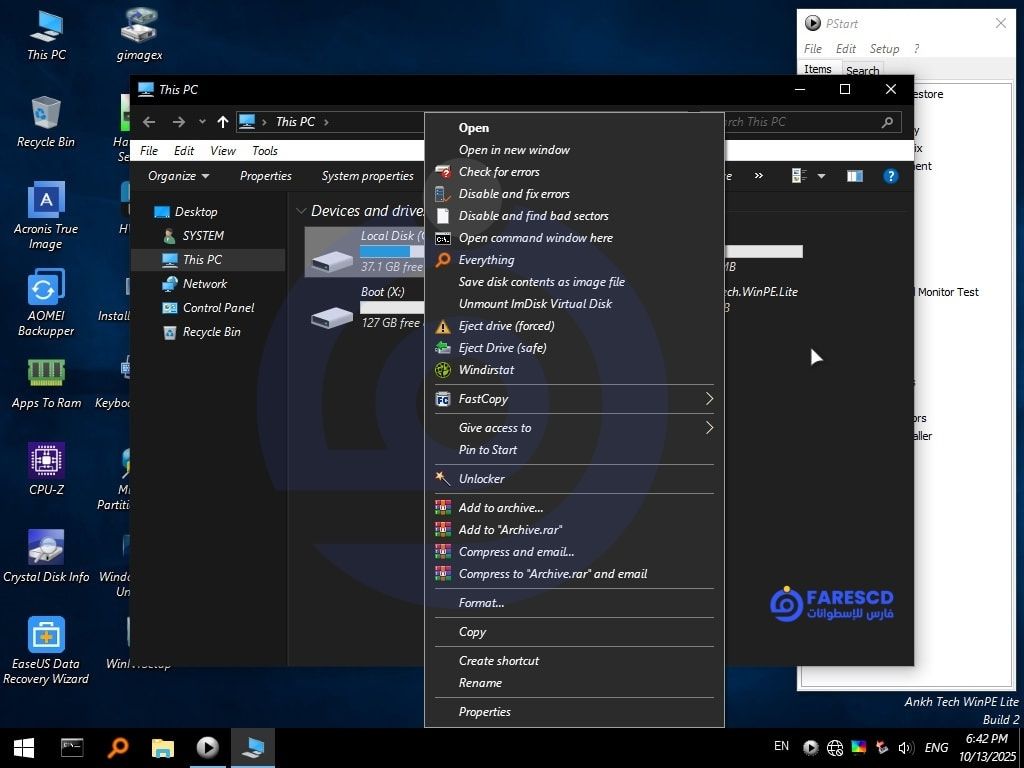 توزيع الأدوات بين Start وPStart مع دمج بعض البرامج في قائمة السياق يتيح تنفيذ مهام مثل فك الضغط، حرق/تركيب ISO، والنسخ السريع بنقرة يمين واحدة.