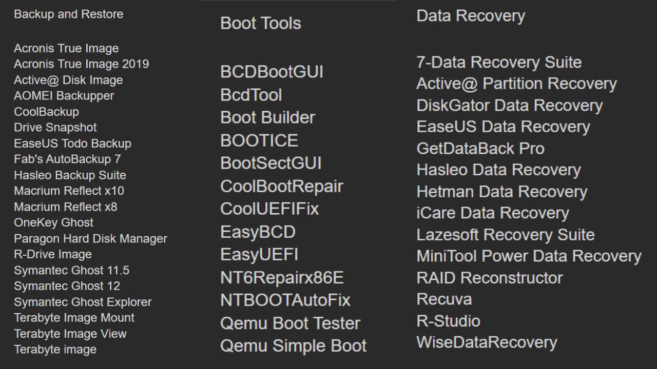 تضم الاسطوانة تشكيلة شاملة من أدوات النسخ الاحتياطي والاستعادة لتغطية جميع سيناريوهات العمل من تصوير الأقراص إلى الاستعادة على عتاد مختلف، مع بدائل متعددة داخل كل فئة لضمان المرونة والموثوقية للفنيين.