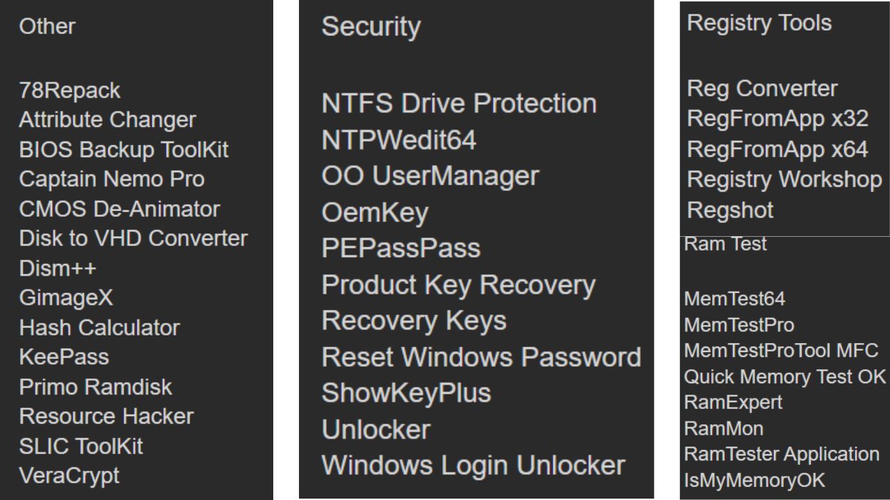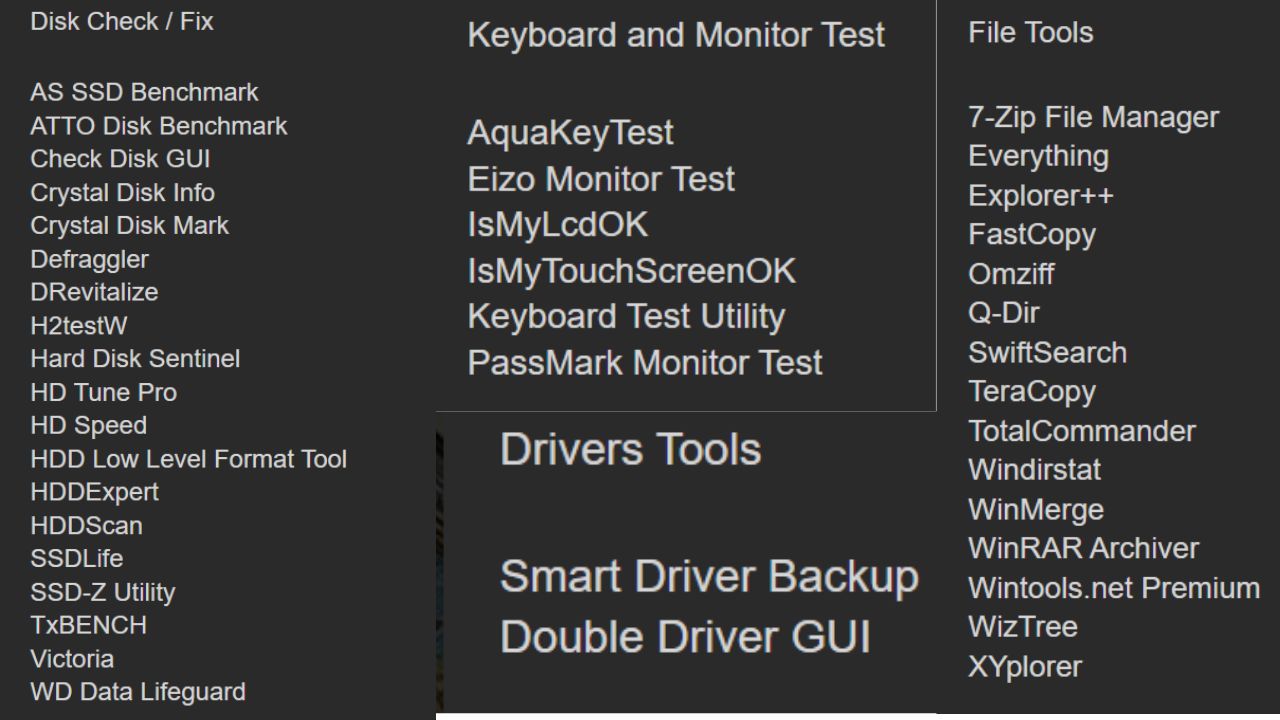 تتضمن أنظمة النسخ الاحتياطي، إدارة الأقسام، فحص القرص الصلب، استعادة البيانات، واختبار المعالجات والذاكرة، مع دمج أدوات مثل Acronis True Image، Macrium Reflect، EaseUS Todo Backup، وAOMEI Backupper. كما تم تفعيل كل البرامج مسبقاً لضمان أداء ثابت وخالٍ من الأعطال، مع واجهة استخدام منظمة عبر أدوات PStart وقائمة Start لتسهيل الوصول الفوري إلى جميع الفئات التقنية.