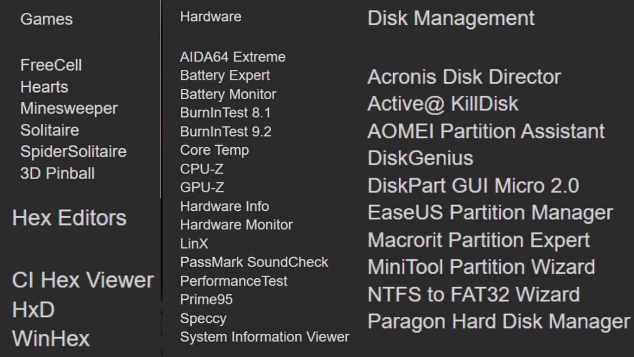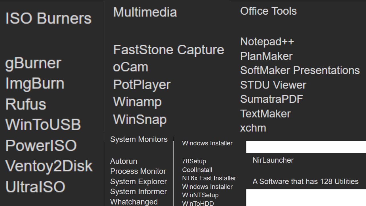 تضم مجموعة واسعة للنسخ الاحتياطي، إدارة الأقراص، واختبار العتاد مثل Acronis وMacrium وEaseUS وAOMEI، ما يقلل تبديل الوسائط ويرفع الإنتاجية في دورات الصيانة السريعة.