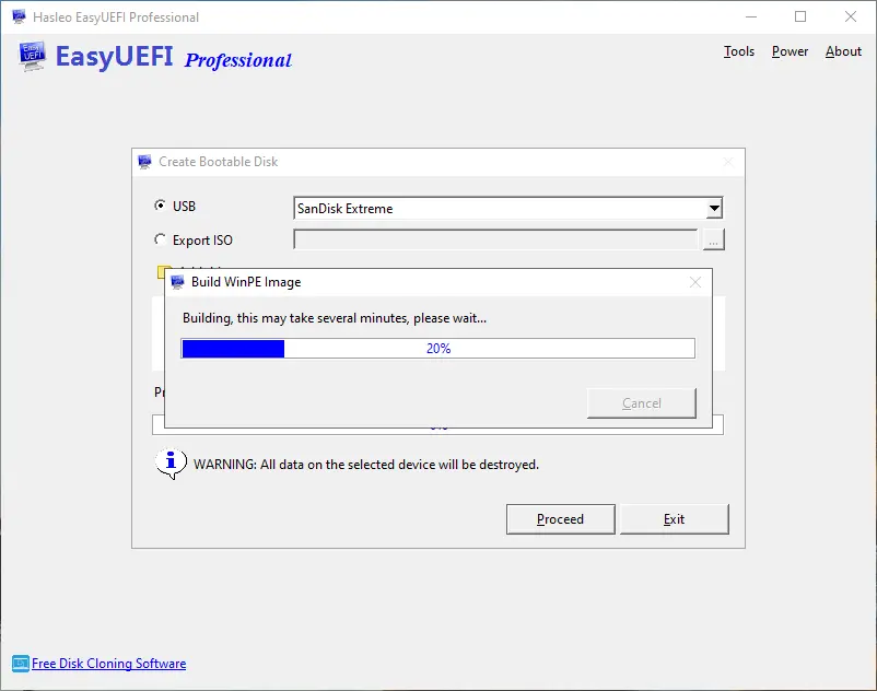 إنشاء فلاشة إقلاع تحتوي على EasyUEFI WinPE يتم باستخدام البرنامج نفسه أو أدوات مثل Rufus أو Hasleo WinToUSB، من خلال تحميل ISO الجاهز ونسخه على فلاشة USB بسعة 8 جيجا على الأقل.