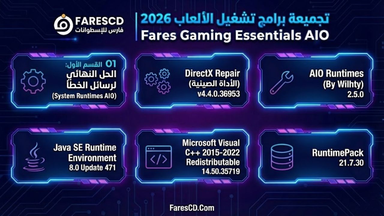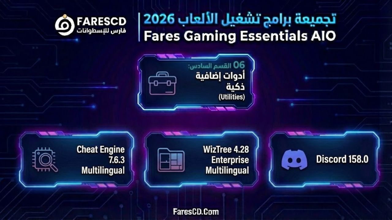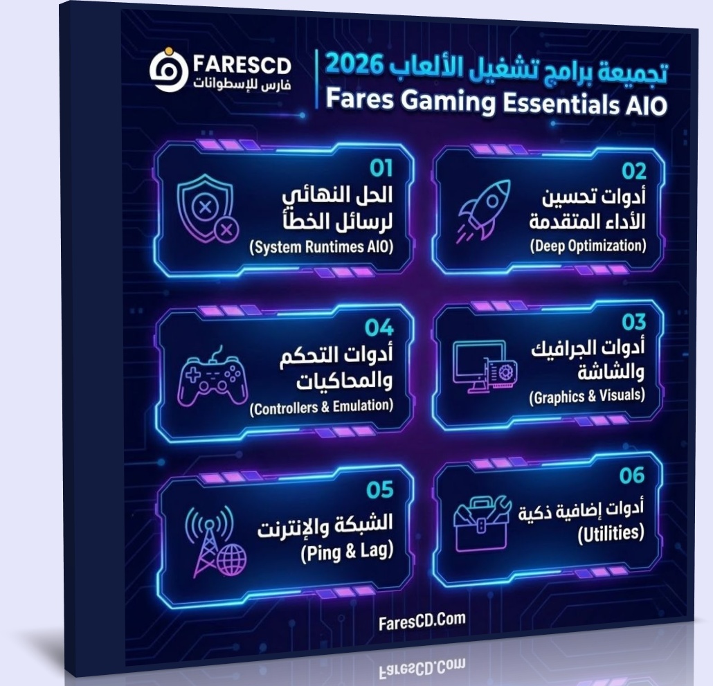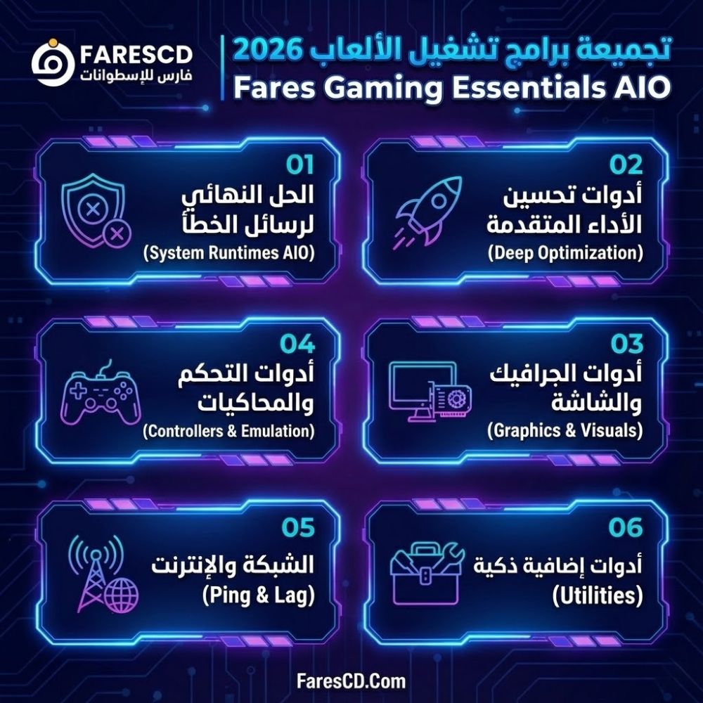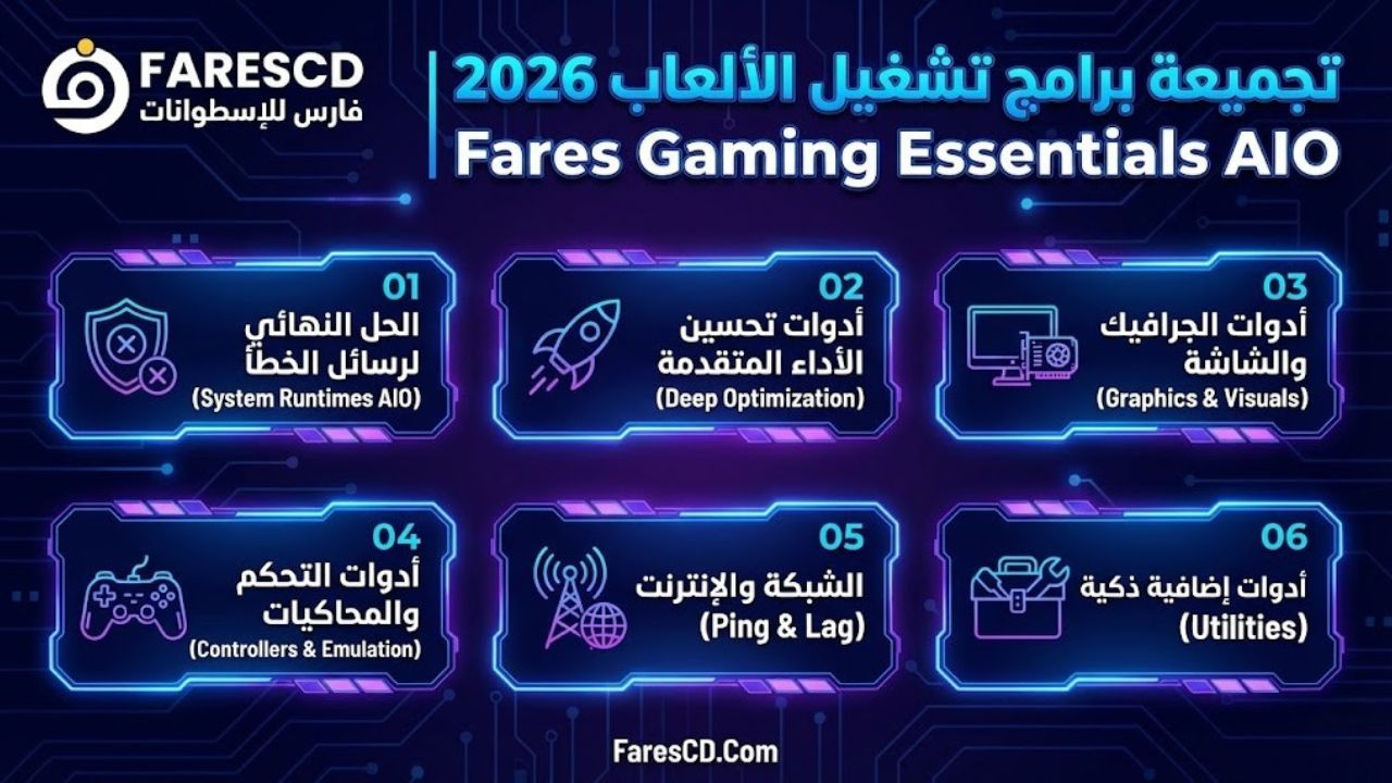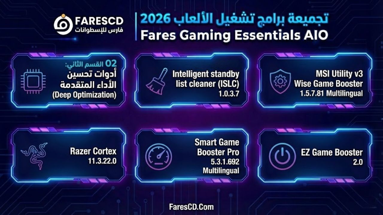 Fares Gaming Essentials AIO 2026 مش مجرد “برامج مجمعة”، دي حقيبة إنقاذ للاعبين: تثبت الأساسيات، تظبط الأداء، وتجهز جهازك لتجربة لعب أنعم وأثبت.