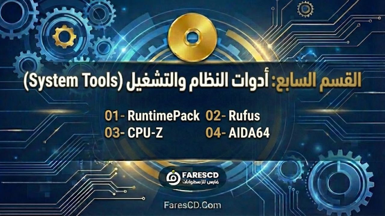 7️⃣ أدوات النظام الأساسية (System Tools) من حرق الويندوز على الفلاشة ببرنامج Rufus، إلى معرفة تفاصيل قطع جهازك بدقة مع CPU-Z، وحزمة RuntimePack لتشغيل الألعاب والبرامج دون رسائل خطأ.