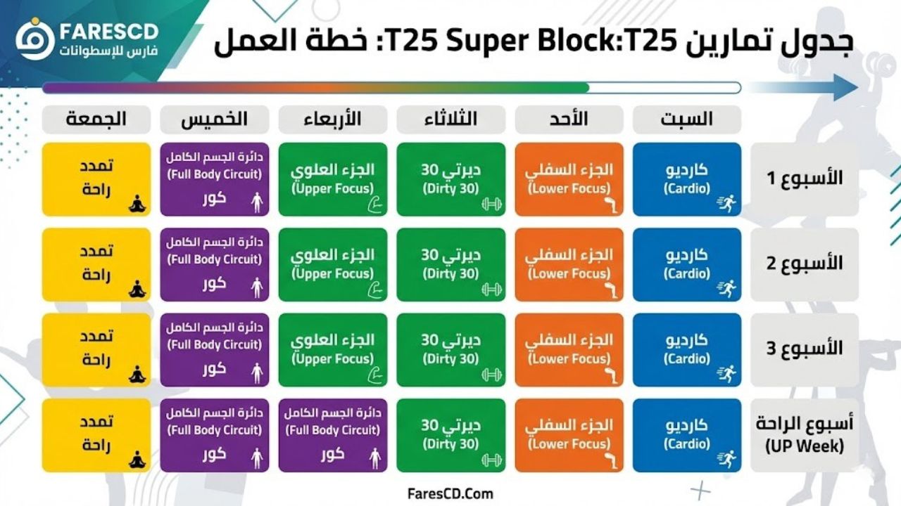 T25 Super Block الجديد: يعتمد على نظام “البلوك” الشهري. يتكون من 3 أسابيع من العمل الشاق + أسبوع رابع للراحة النشطة (UP Week). هذا النظام يمنع الجسم من التعود ويقلل من خطر الإصابة والإرهاق.