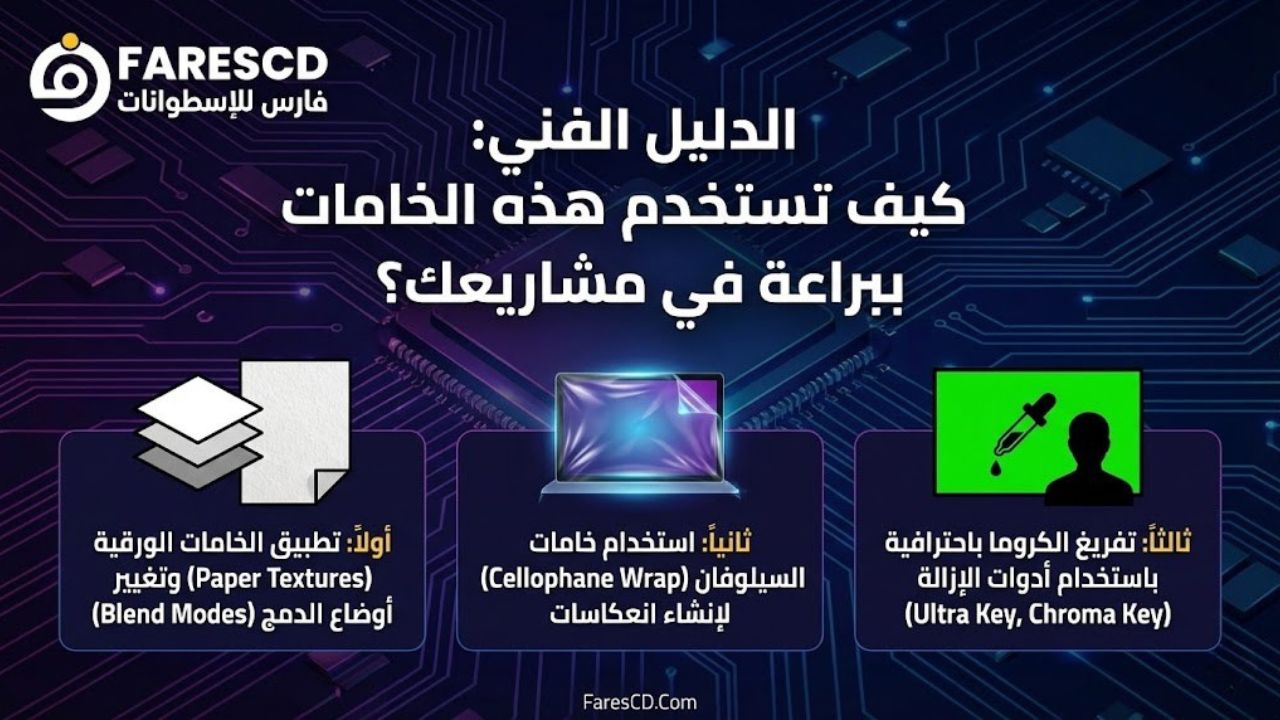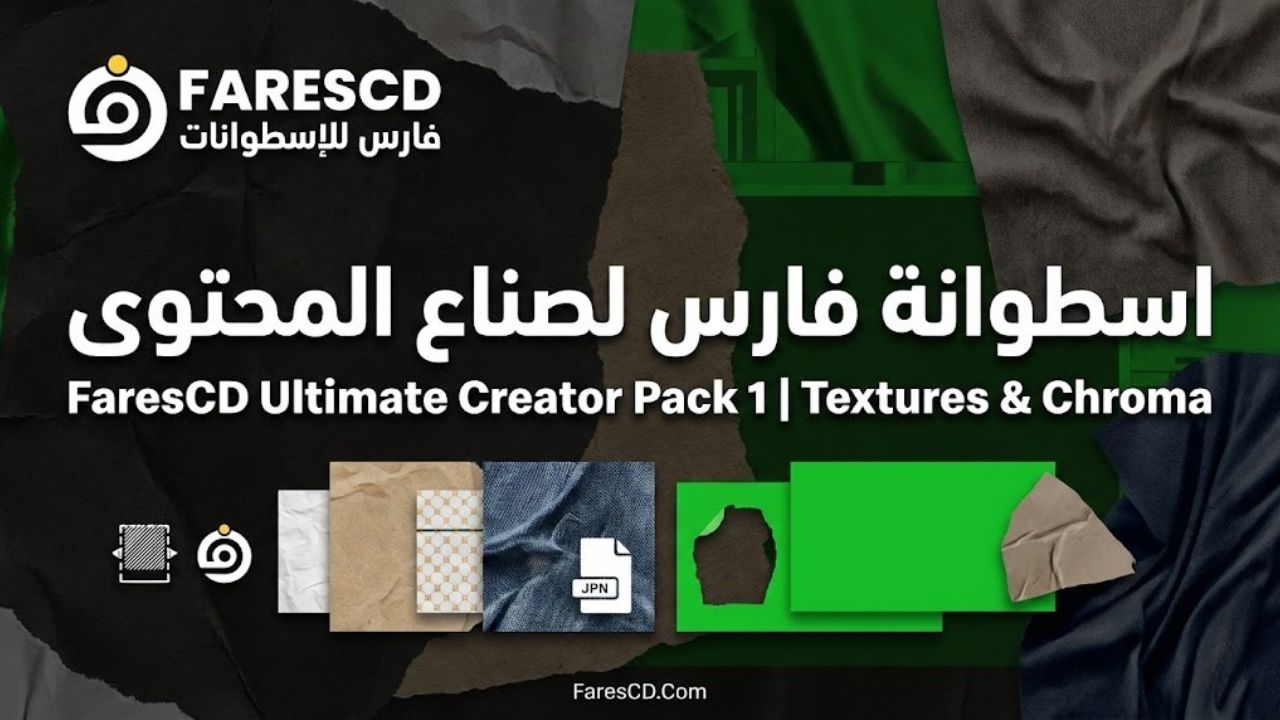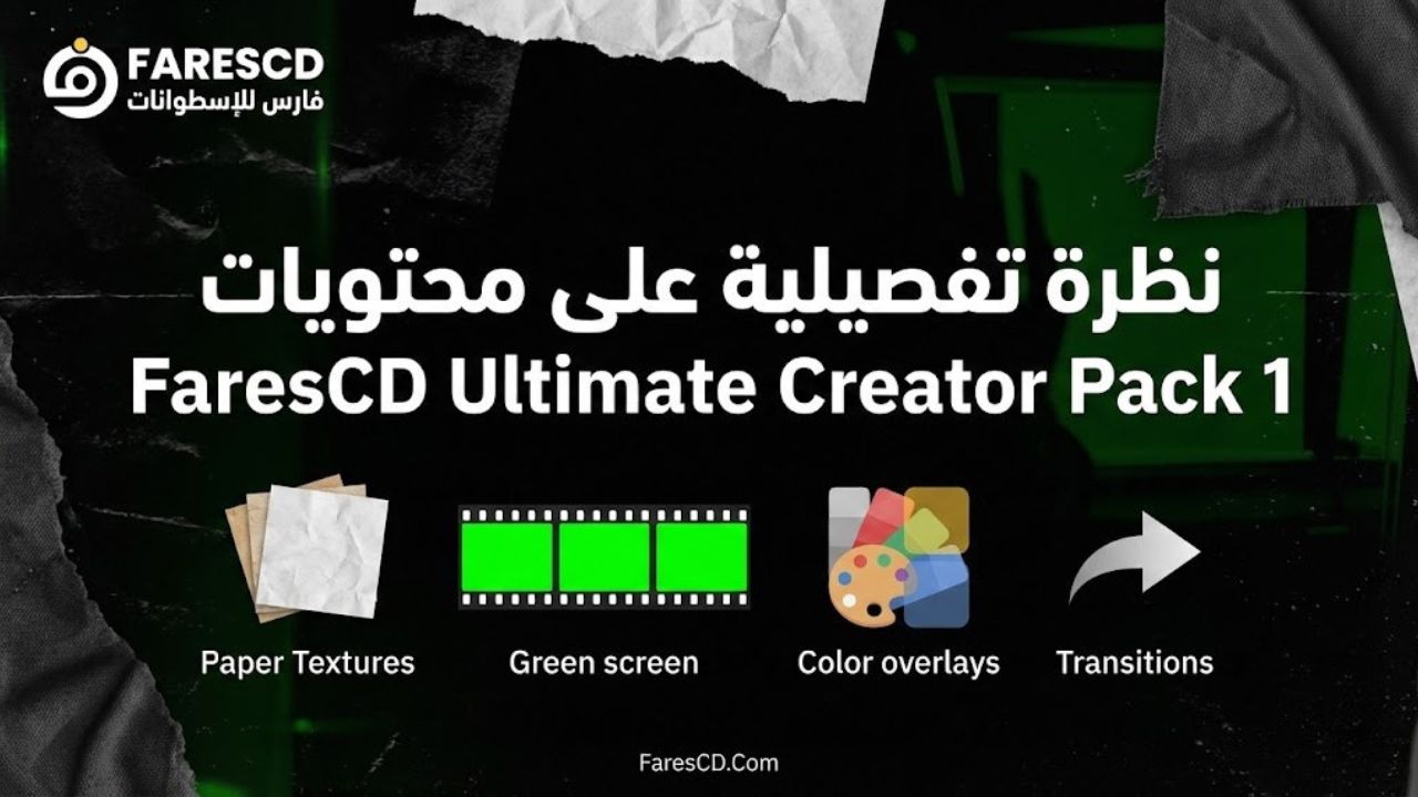 اسطوانة فارس لصناع المحتوى FaresCD Ultimate Creator Pack 1 | Textures & Chroma هي حجر الأساس الذي يحتاجه كل مونتير لنقل فيديوهاته من المستوى العادي إلى الاحتراف السينمائي بضغطة زر.
