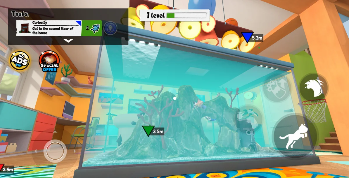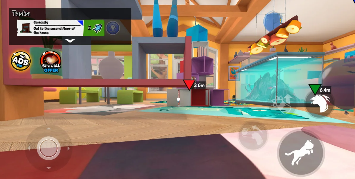 عصا التحكم (Joystick): تقع على اليسار للتحرك في جميع الاتجاهات. الحركة تتميز بالواقعية، حيث تشعر “بثقل” القطة وسرعتها المتزايدة عند الركض (Sprint).