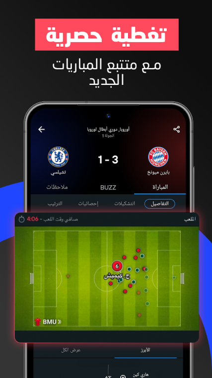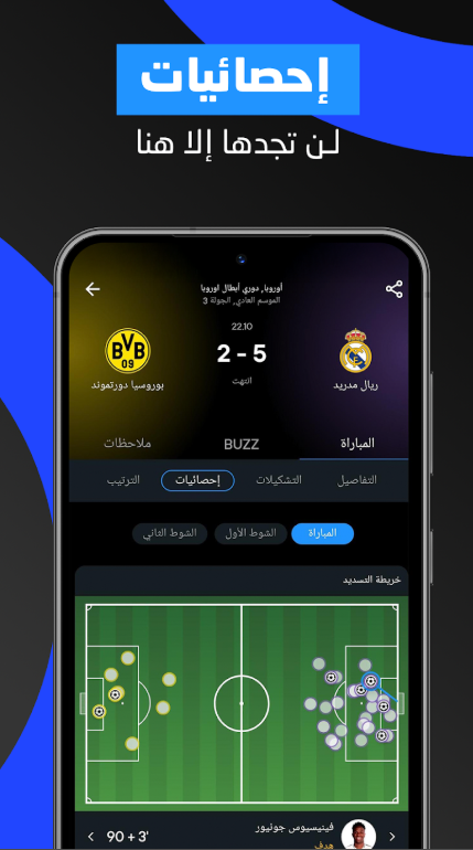 - الإحصائيات الحية: يتيح لك التطبيق عرض الإحصائيات الحية للمباريات، مثل الأهداف والتسجيلات والتصويبات.