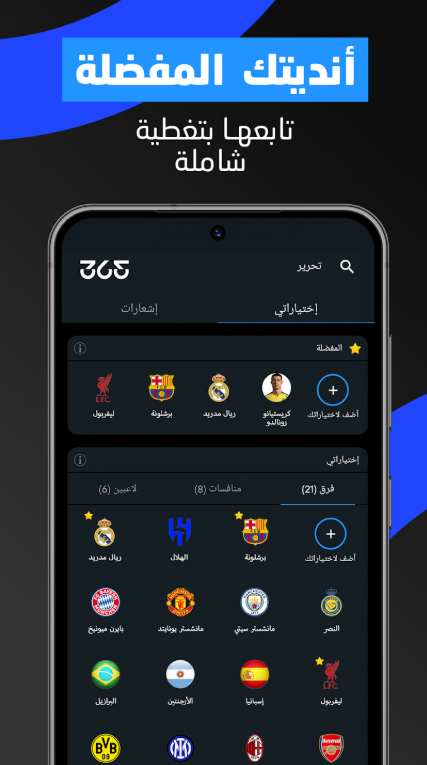 يمكن للمستخدمين تخصيص التطبيق ليتلقوا التنبيهات حول فرقهم المفضلة والدوريات التي يرغبون في متابعتها.