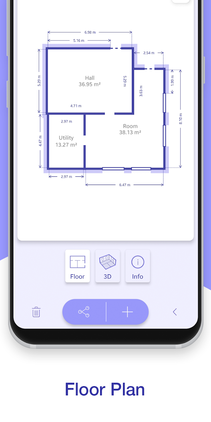 • مشاركة قياسات مخطط أرضية المنزل عبر البريد الإلكتروني، والرسائل، والشبكات الاجتماعية، وما إلى ذلك.