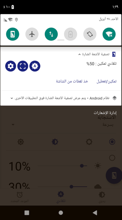 نصيحة احترافية: إذا كنت تقوم بتثبيت تطبيقات أخرى بصيغة APK، قد تحتاج لإيقاف الفلتر مؤقتاً، حيث أن نظام الأندرويد يمنع زر “تثبيت” من العمل أثناء وجود فلتر شاشة لأسباب أمنية. التطبيق يوفر زراً سريعاً في شريط الإشعارات لهذا الغرض (Pause).