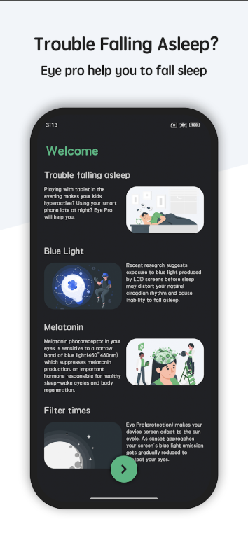 بعض الهواتف الذكية تأتي بشاشات ساطعة جداً حتى على أدنى مستوى إضاءة. تطبيق Eye Pro يحل هذه المشكلة من خلال: