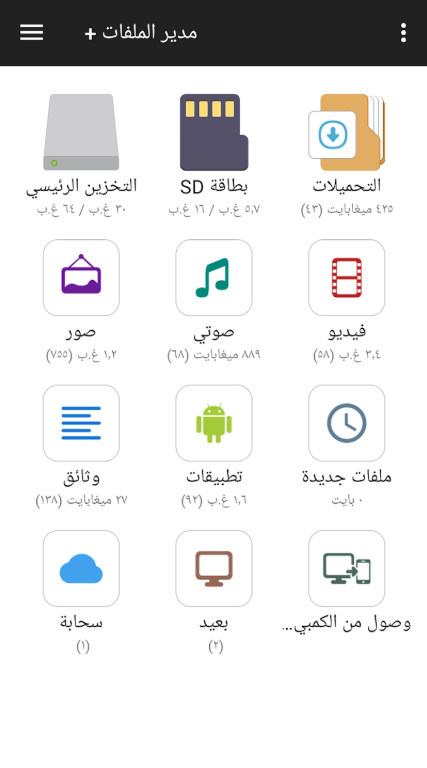 - إدارة التخزين: يساعد المستخدمين على إدارة الملفات المخزنة في الذاكرة الداخلية للجهاز أو على بطاقة SD.