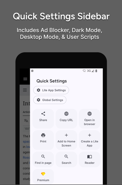 تصفح أسرع ، وحفظ البيانات ، وحظر الإعلانات ، وحماية خصوصيتك ، وتصفح في الوضع الليلي ، وعرض القارئ ، وتخصيص تطبيقات Lite الخاصة بك مع أكثر من 20 إعدادًا مختلفًا لكل تطبيق Lite! كل ذلك في تطبيق 3 ميغابايت.