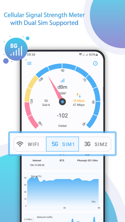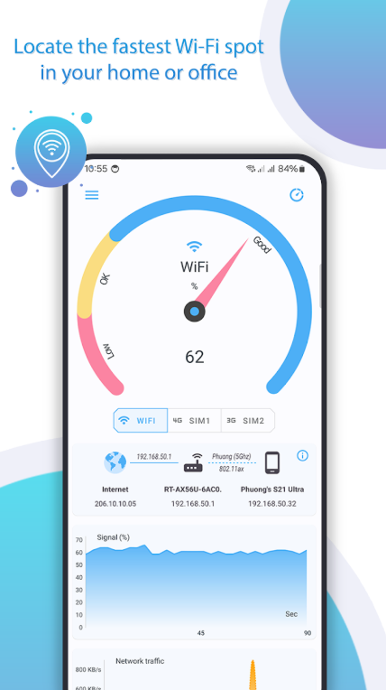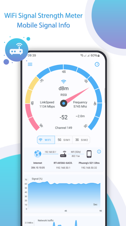 تكمن قوة التطبيق في بساطته ودقته؛ حيث يقدم واجهة رسومية تشبه “عداد السرعة” في السيارات، تتحرك فورياً مع كل خطوة تخطوها داخل منزلك أو مكتبك. هذا يسمح لك برؤية تأثير الجدران، الأبواب، والأجهزة الإلكترونية الأخرى على جودة الإشارة التي تصل لهاتفك.