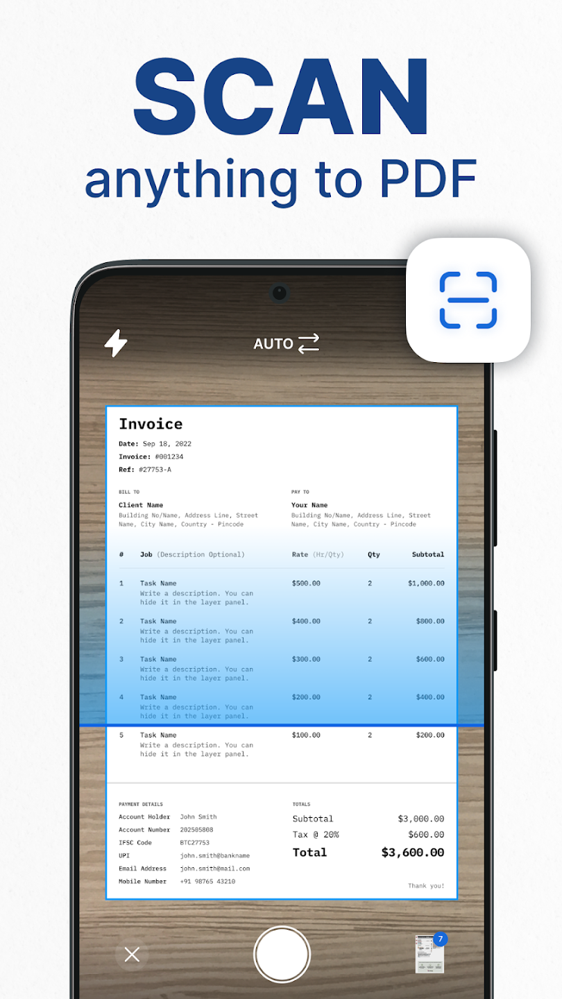 - • تحويل أي كتابة ورقية إلى PDF، مثل العقود والفواتير والفواتير والإيصالات والشهادات والدفاتر والمذكرات وبطاقات العمل وغيرها.