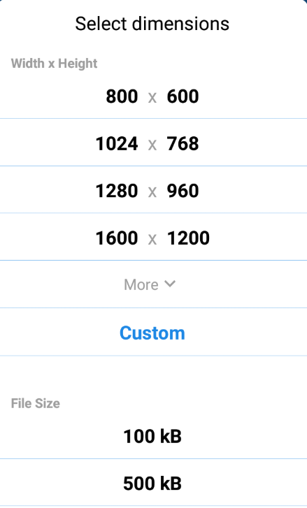 تحديد الإعدادات: اختر من القائمة “File Size” (حجم الملف). هنا يمكنك اختيار “100 KB” أو “500 KB”. سيقوم التطبيق تلقائياً بضبط الأبعاد والجودة للوصول لهذا الحجم المستهدف.