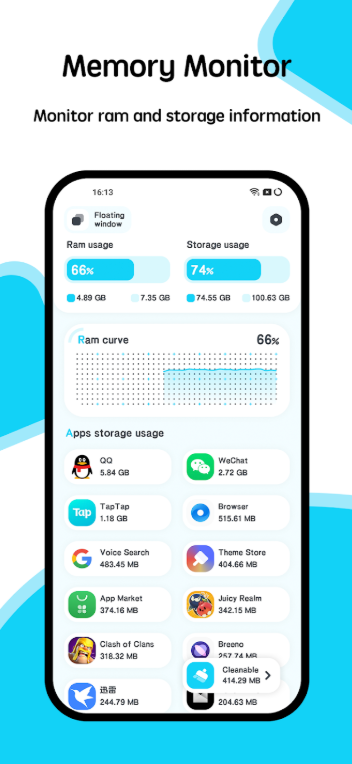 من خلال هذا التطبيق، يمكن للمستخدم أن يتبع استخدام الذاكرة بشكل دقيق وفعال، حيث يقدم تقريراً يوضح كمية الذاكرة المستخدمة والمتبقية، وذلك بشكل مفصل ومحدث بشكل دوري.