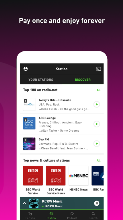 تيح لك تطبيق radio.net PRIME الوصول غير المحدود إلى أكثر من 30,000 محطة إذاعية من جميع أنحاء العالم. يمكنك العثور على محطات إذاعية حسب النوع، أو حسب الموقع، أو حسب المحتوى.