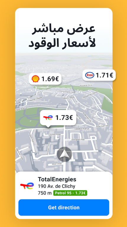 • اضبط نوع الوقود الخاص بك وقم بتعبئة الوقود للحصول على أفضل سعر من خلال معلومات مباشرة حول أسعار الوقود*