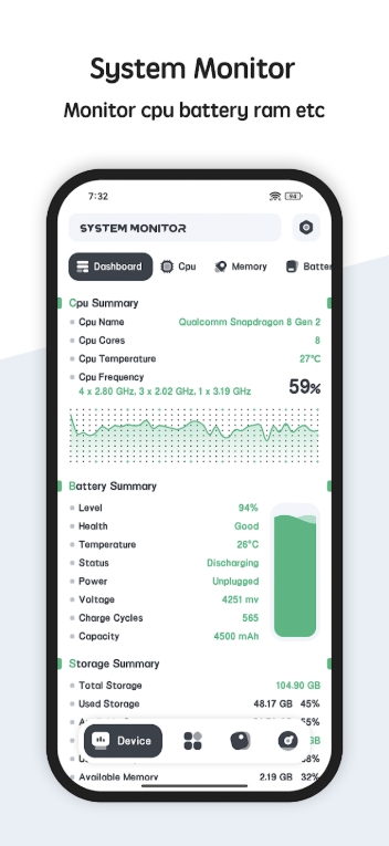 - يتيح لك تطبيق System Monitor Cpu Ram Battery مراقبة استهلاك الذاكرة (RAM) والمعالج (CPU) ومستوى البطارية بطريقة مفصلة.