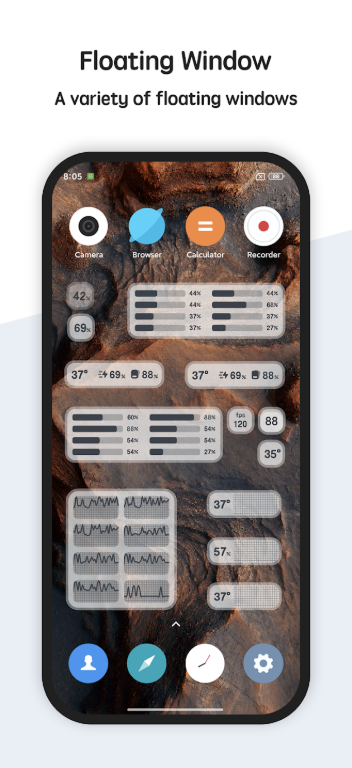 • تعرض النافذة العائمة درجة حرارة وحدة المعالجة المركزية ودرجة حرارة البطارية واستخدام ذاكرة الوصول العشوائي في الوقت الفعلي ، بما في ذلك: نافذة عائمة لشريط الحالة ونافذة عائمة لسطح المكتب. - الأدوات – Widget