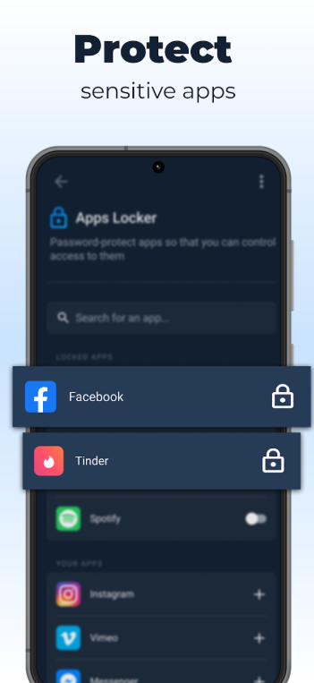 تتيح لك خزانة تطبيقات الهاتف المحمول قفل التطبيقات بكلمة مرور مخصصة لتجنب وصول الآخرين إليها، مما يزيد من أمان التطبيق وخصوصيته.