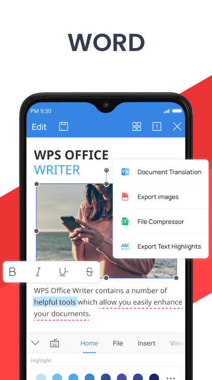 - إنشاء وتحرير المستندات: يدعم WPS Office إنشاء وتحرير المستندات بتنسيقات Word و Excel و PowerPoint و TXT و PDF.