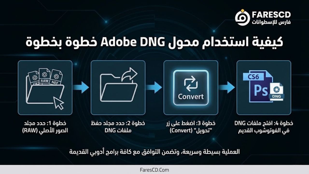 هنا يأتي دور Adobe DNG Converter. هذا البرنامج المجاني يعمل “كمترجم فوري”. هو يأخذ ملفات RAW الخاصة بكاميرتك الجديدة (التي لا يفهمها برنامجك القديم)، ويقوم بتحويلها إلى صيغة DNG العالمية (التي يفهمها أي إصدار من برامج أدوبي تقريباً، حتى القديمة جداً منها)، كل ذلك دون فقدان أي جودة في الصورة.