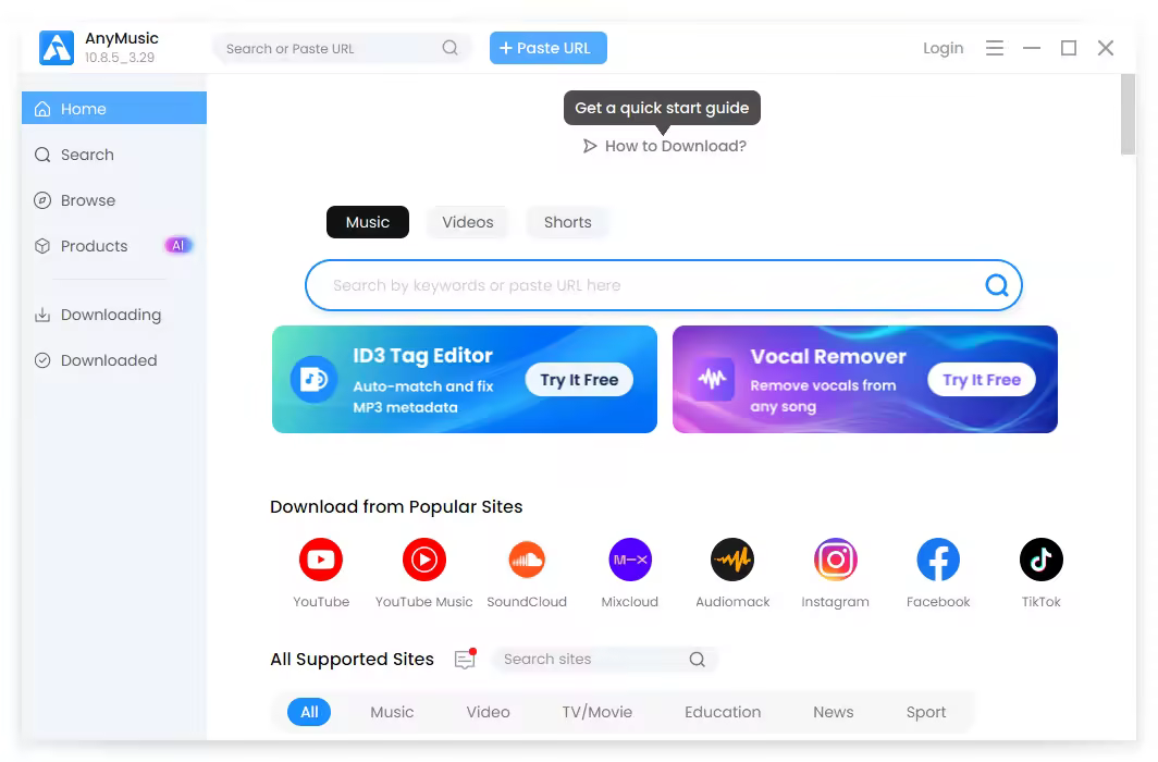 يمكن البحث وتنزيل الأغاني والفيديوهات من أكثر من 1000 موقع عبر AnyMusic بثلاث خطوات واضحة: ابحث بالكلمات أو الصق الرابط، عاين النتيجة داخل المشغل المدمج، ثم اختر الصيغة والجودة وابدأ التنزيل فوراً.