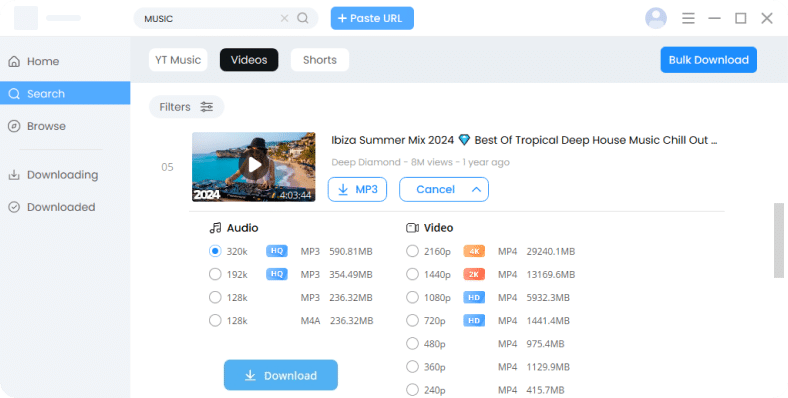 يوفر تنزيلات عالية الجودة حتى 320kbps بصيغ MP3 وM4A وWebM، إضافة إلى تنزيل الفيديو حتى 4K وحفظه كـ MP4.