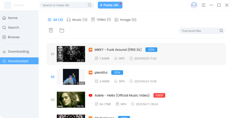 يتم حفظ الملفات بشكل منظم في تبويب Downloaded مع تصنيف موسيقى/فيديو لتسهيل الوصول السريع.