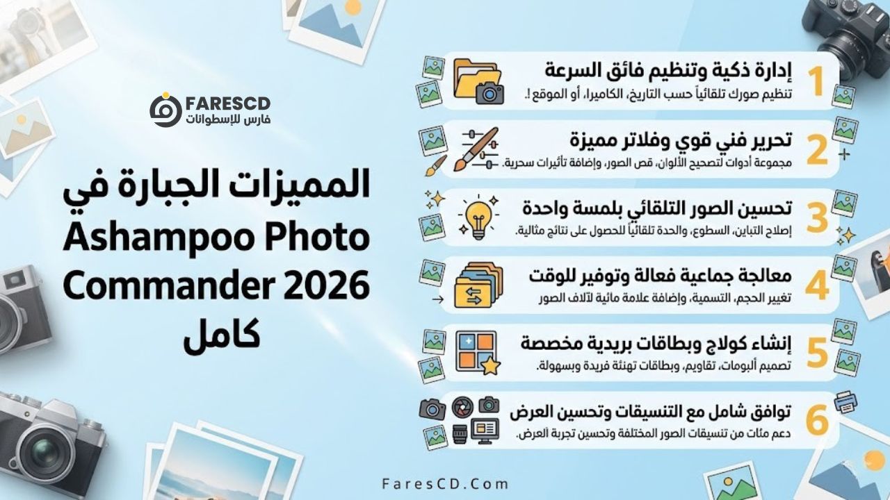 برنامج Ashampoo Photo Commander 2026 ليس مجرد عارض صور تقليدي، بل هو الاستوديو الشامل الذي سيغير طريقتك في التعامل مع ذكرياتك الرقمية إلى الأبد! إذا كنت تعاني من فوضى الصور المتراكمة على جهازك، أو تبحث عن أداة سريعة واحترافية لتعديل وتحسين جودة صورك دون الغوص في تعقيدات برامج التصميم الثقيلة، فأنت الآن في المكان الصحيح.