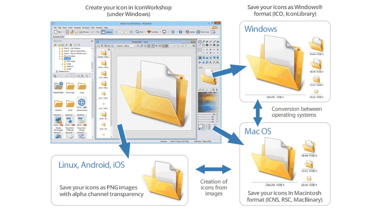 Axialis IconWorkshop Professional يتميز ببيئة عمل متكاملة لإنشاء وتحرير الأيقونات متعددة المقاسات والصيغ بدعم كامل للشفافية المتقدمة (Alpha channel) والطبقات، مما ينتج رموز “Pixel-Perfect” عالية الدقة لجميع المنصات مثل Windows، macOS، iOS، وAndroid.