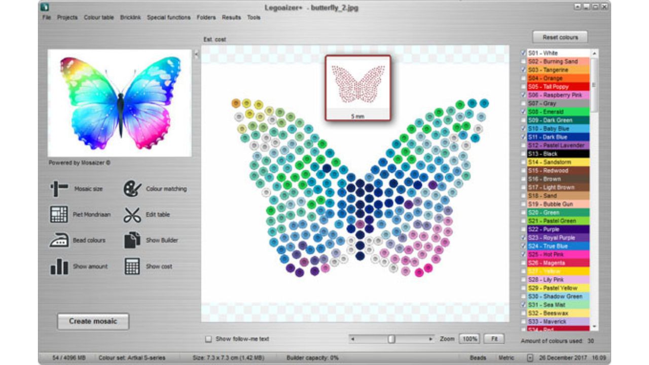 البرنامج يعتمد على محركات ألوان عالية الجودة لضمان تطابق دقيق بين ألوان الصورة الأصلية والتصميم الناتج، ويتيح خيارات واسعة لتحرير الألوان وتغييرها حسب الحاجة لتقليل التكلفة أو تحسين المظهر. كما يدعم العمل مع قطع وألوان محددة مثل ألوان RAL وPantone، مما يزيد من دقة التفاصيل وإمكانية تطبيق التصميمات في مشاريع فعلية كالفسيفساء الجدارية أو الهدايا الشخصية.