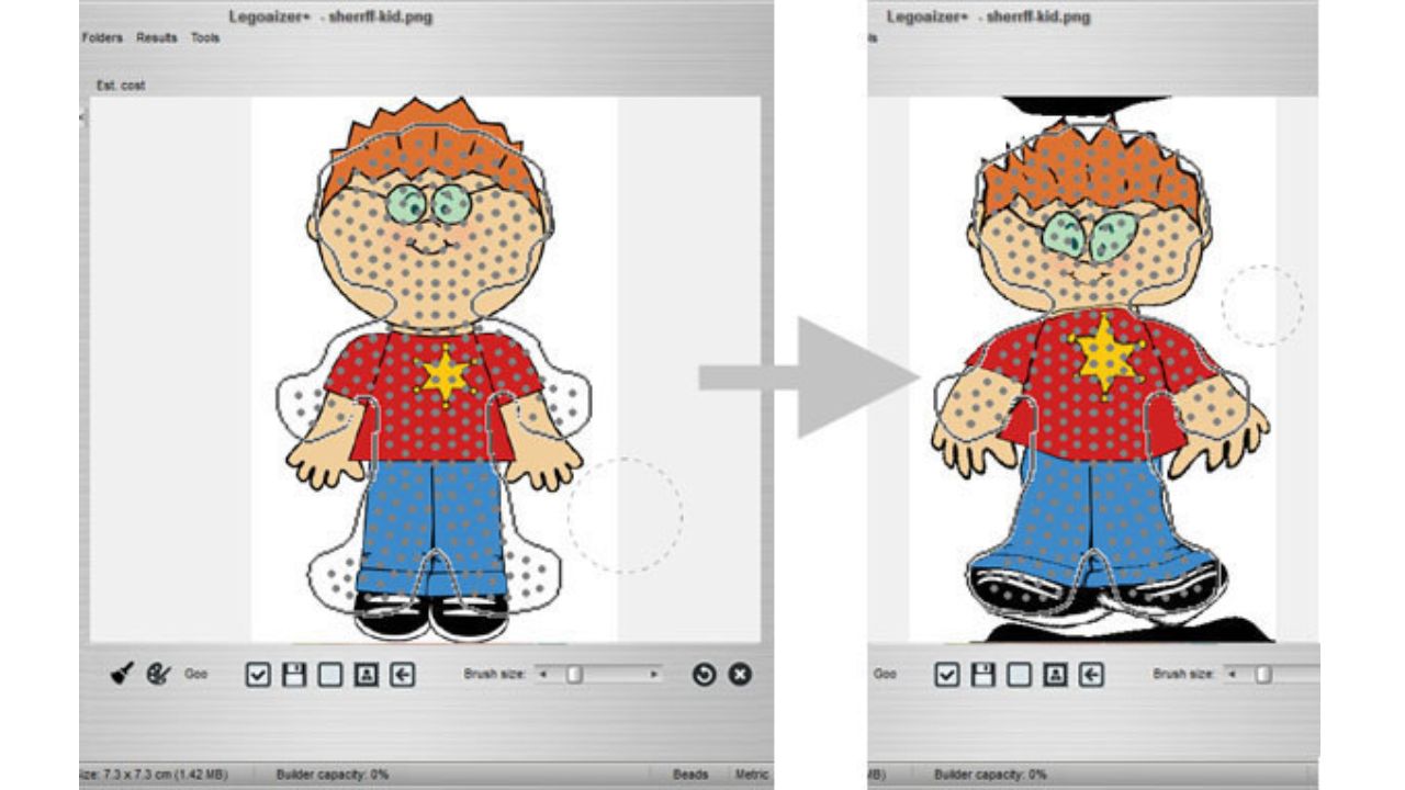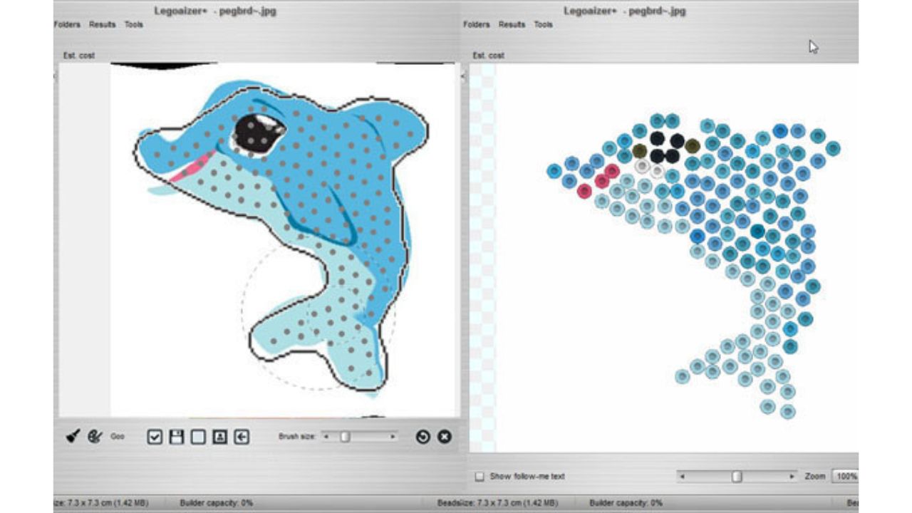 بعد ذلك يحوّل البرنامج الصورة إلى شبكة مربعات (Grid)، ويستبدل كل مجموعة بكسلات في الصورة الأصلية بقطعة طوب واحدة مع اختيار اللون الأقرب من لوحة ألوان الطوب أو الخرز المتاحة فعلياً.