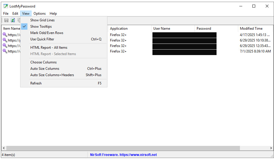 ستظهر قائمة بكلمات المرور مع الحقول الداعمة مثل اسم البرنامج واسم المستخدم وتواريخ الإنشاء/التعديل، ويمكن تخصيص الأعمدة من قائمة View لعرض ما يهمك فقط.