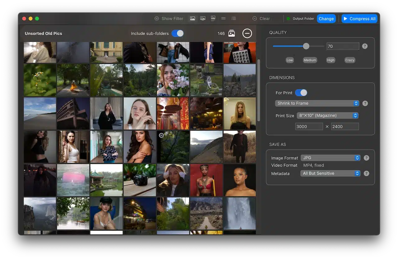 حوّل إدارة الصور إلى مهمة سريعة وسهلة. اضبط الجودة والمقاس والصيغة، واسمح للأداة بإنجاز ضغط دفعات ضخمة بسرعة مع الحفاظ على الوضوح. يدعم تنسيقات إدخال واسعة بما فيها RAW، ويصدر إلى JPG/PNG/WebP/AVIF وGIF مع خيارات تنظيم مرنة للمخرجات. واجهة معاينة دقيقة على مستوى البيكسل، وفلاتر أسماء بعبارات Regex، واستبقاء أو تنظيف الميتاداتا حسب السياسة. مناسب لمواقع التجارة الإلكترونية، فرق التسويق، والمصورين الذين يحتاجون نتائج متسقة بسرعة.