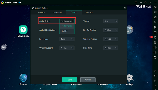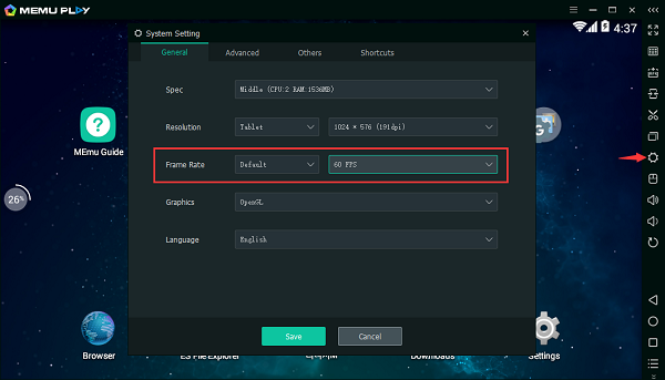 افتح إعدادات MEmu (أيقونة الترس في الشريط الجانبي).