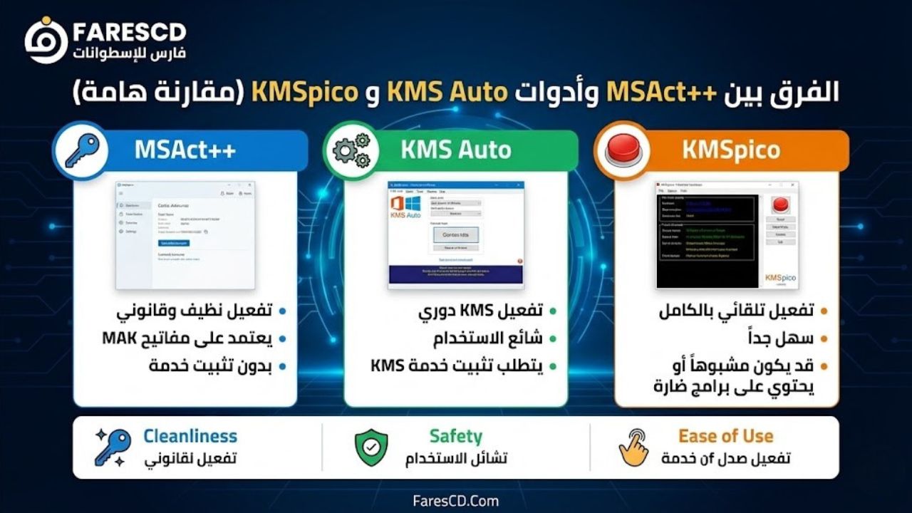 الفرق بين MSAct++ وأدوات KMS Auto و KMSpico (مقارنة هامة)