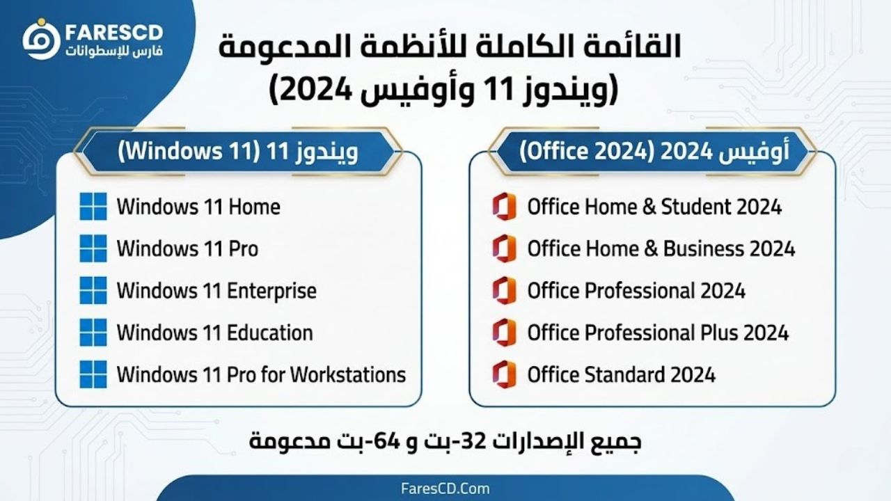 القائمة الكاملة للأنظمة المدعومة (ويندوز 11 وأوفيس 2024)