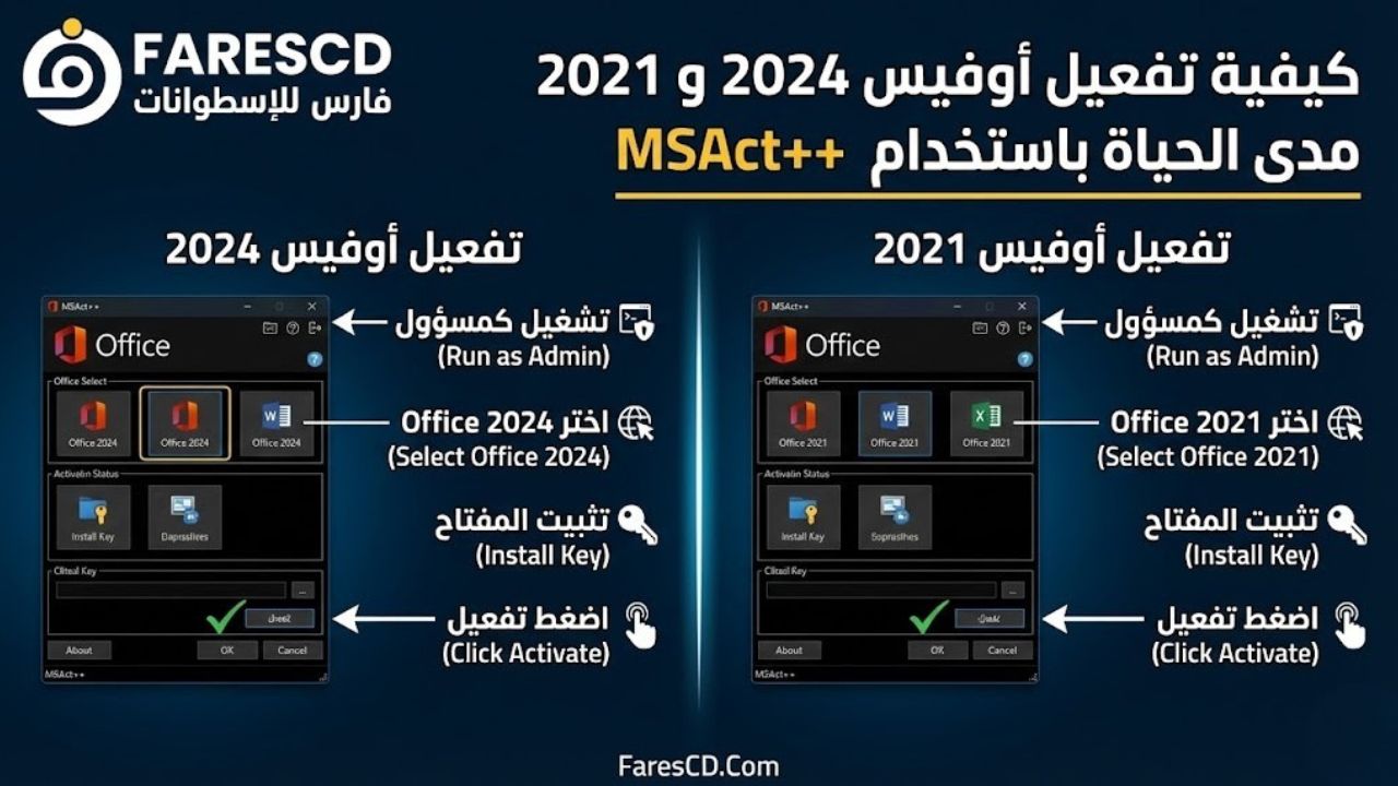 تعتبر حزمة Office 2024 و Office 2021 من أصعب البرامج في التفعيل نظراً للقيود الأمنية المشددة من مايكروسوفت. لكن الجميل في أداة MSAct++ أنها لا تقوم “بكسر” البرنامج (Crack)، بل تقوم بتثبيت “مفتاح أصلي” (Retail Key) وتجبر خوادم مايكروسوفت على قبوله بطريقة شرعية.