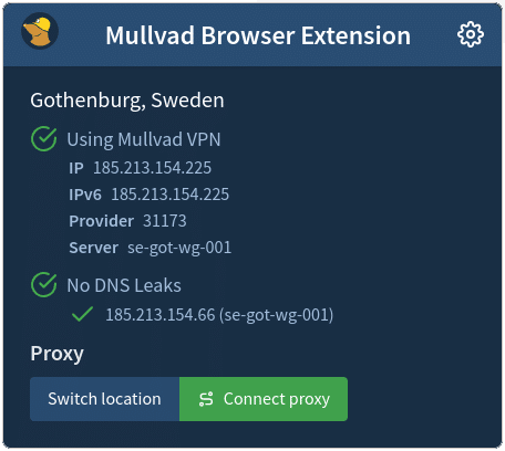 - يتضمّن المتصفح إضافة رسمية تُظهر حالة الاتصال بالـVPN، وتتحقّق من الـIP وموفّر الـDNS وتوصي بإعدادات خصوصية ملائمة بحسب الاتصال.