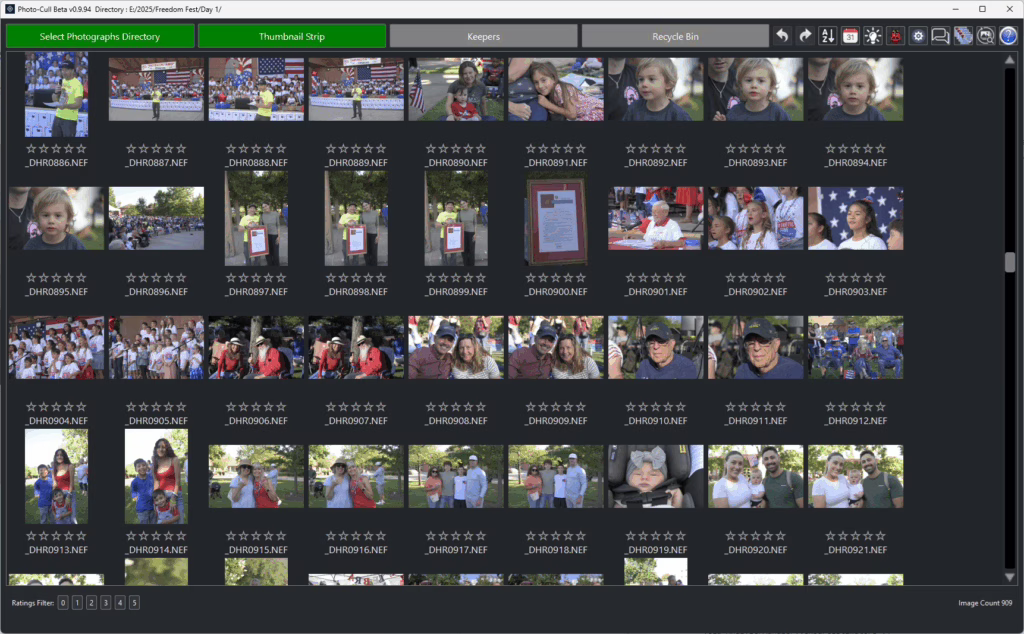 يقرأ البرنامج البُنى الفرعية ويجهّز معاينات سريعة لتسريع التمرير والمقارنة الجانبية داخل كل مجموعة صور متشابهة.