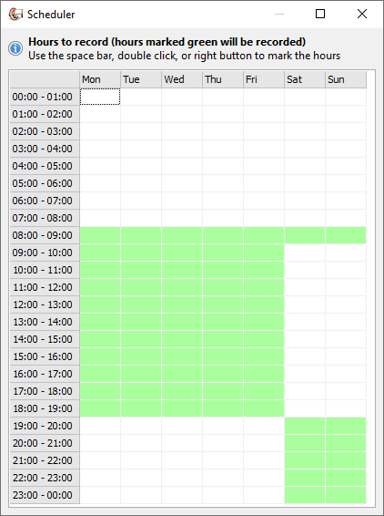 افتح Scheduler وحدّد ساعات وأيام التسجيل المطلوبة، مع التأكد من تفعيل Auto في النافذة الرئيسية لتمكين البدء/الإيقاف التلقائي طبقًا للجدول.