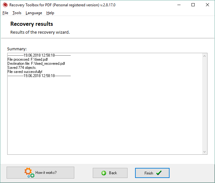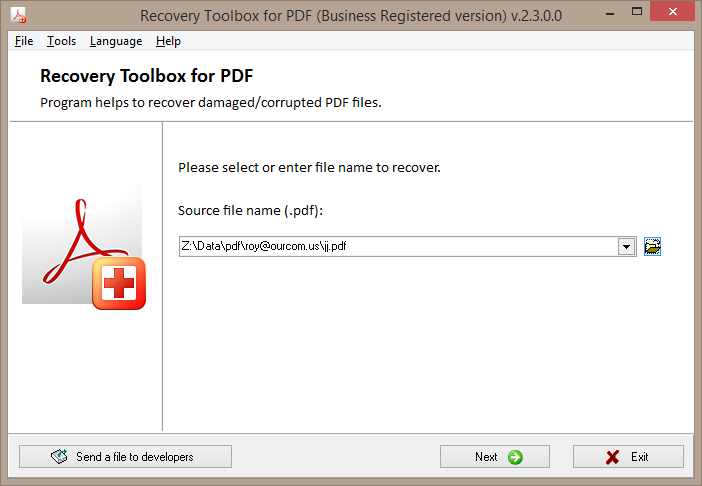 فيما يلي دليل عملي خطوة بخطوة لاستخدام Recovery Toolbox for PDF لإصلاح ملف PDF تالف حتى حفظ النسخة المُصحّحة: