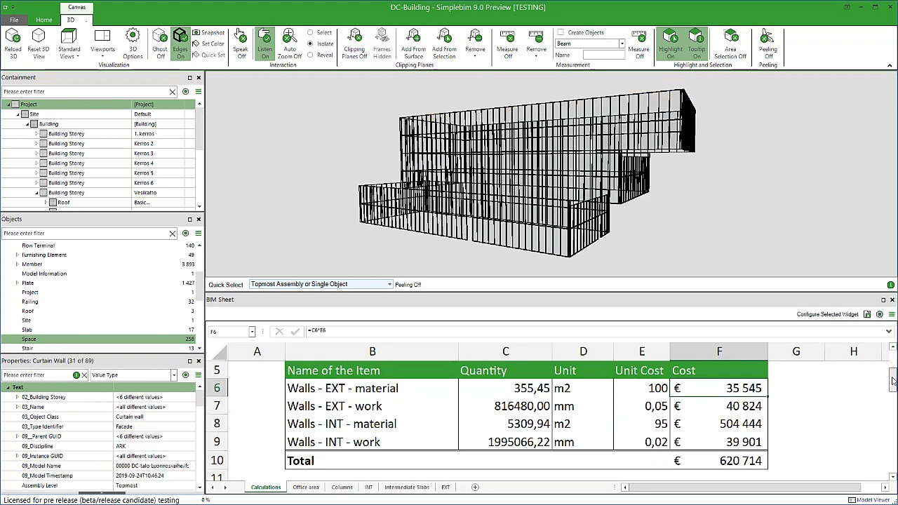 يحسب Simplebim كميات مُطبَّعة من الهندسة مباشرة ويُوحّدها بغضّ النظر عن مصدر النموذج عبر أدوات “Basic Quantities”.