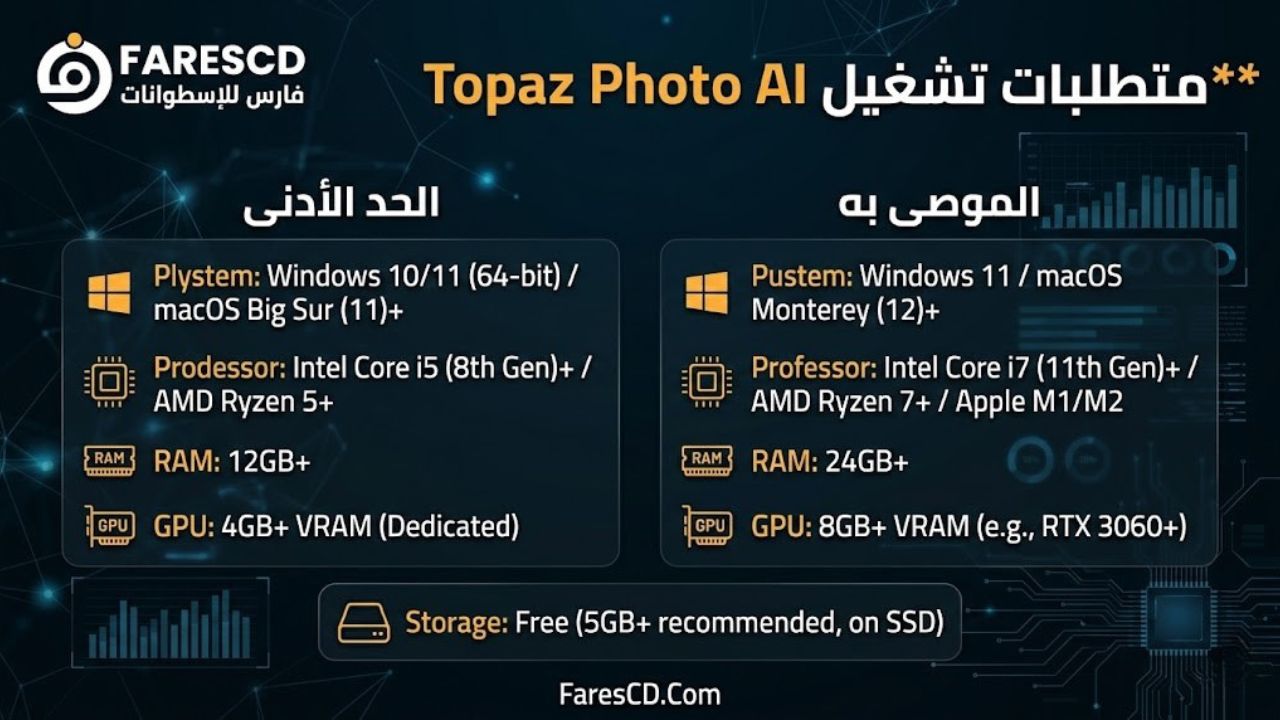 قبل التوجه إلى فقرة Topaz Photo AI تحميل ميديا فاير، من الضروري جداً التأكد من أن جهاز الكمبيوتر الخاص بك قادر على تشغيل تقنيات الذكاء الاصطناعي الثقيلة للبرنامج. إليك جدول يوضح متطلبات النظام:
